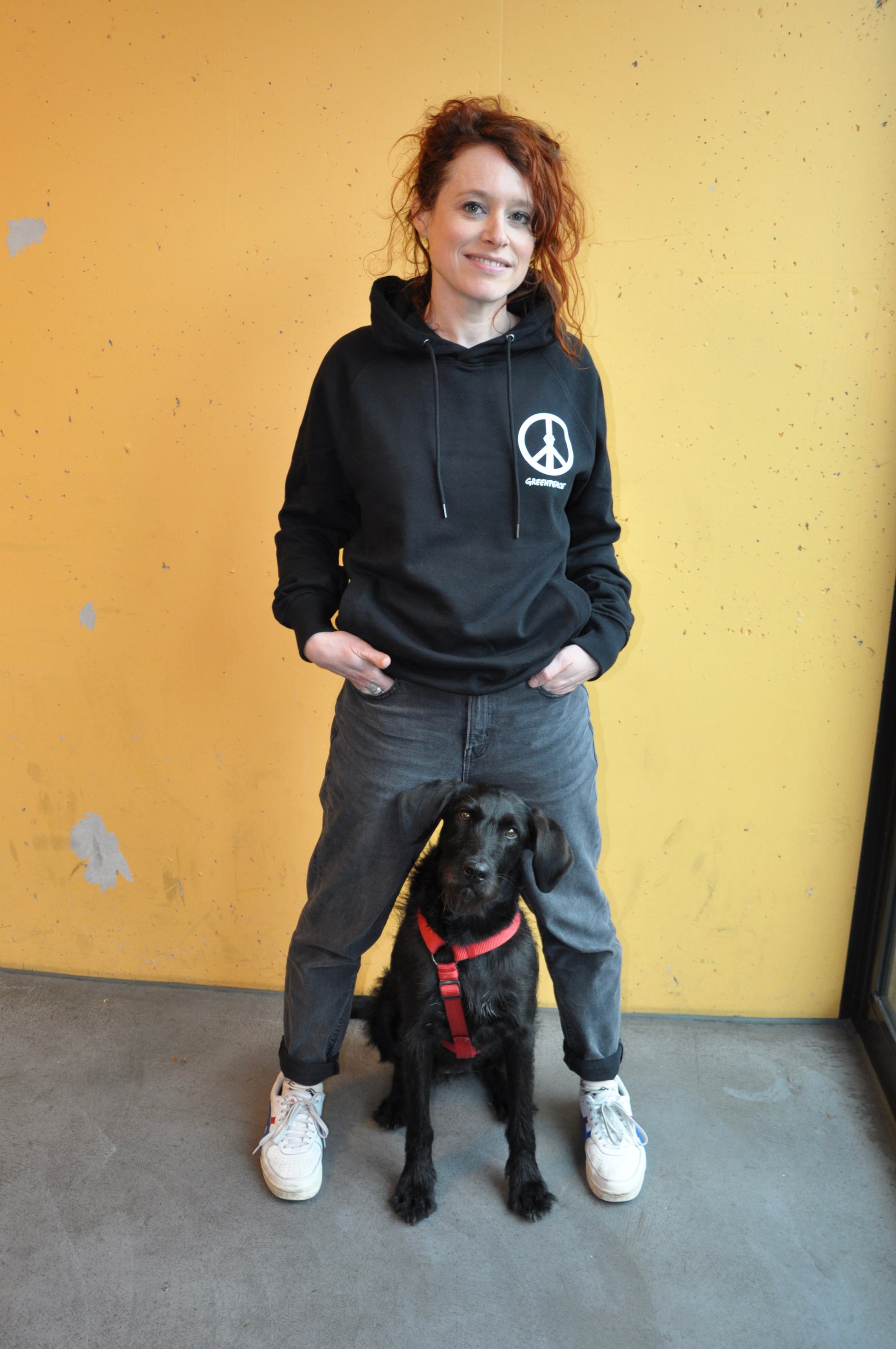 Unser Model Simone (mit Hund) ist 160 cm gross und trägt Grösse S.